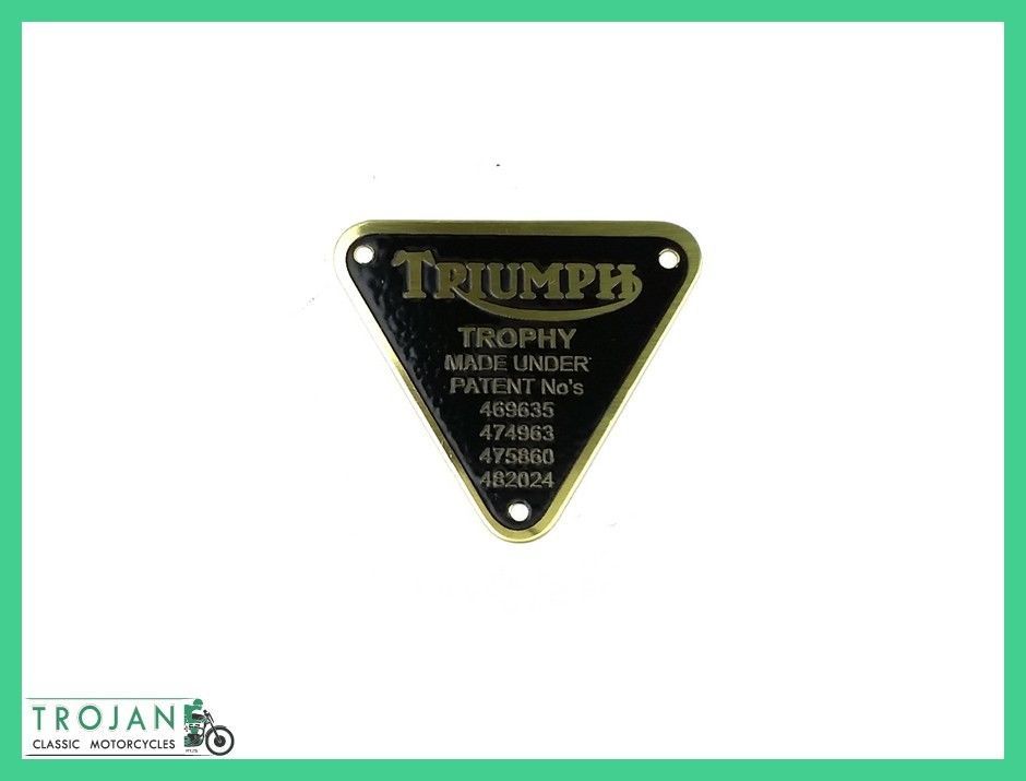 1 piece. High quality brass patent plate badge to suit Triumph pre unit 5T Trophy Twin models (screws not included, please see our other listing for these)