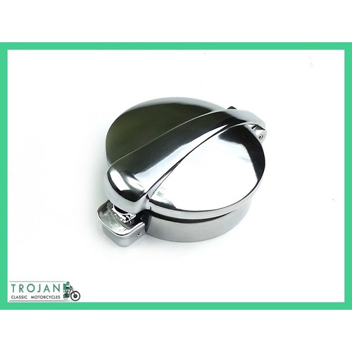 The Monza style cap was fitted to many cafe racers and sports motorcycles. Firm action latch insures the cap stays down tight and when release button is pressed the cap flips open.